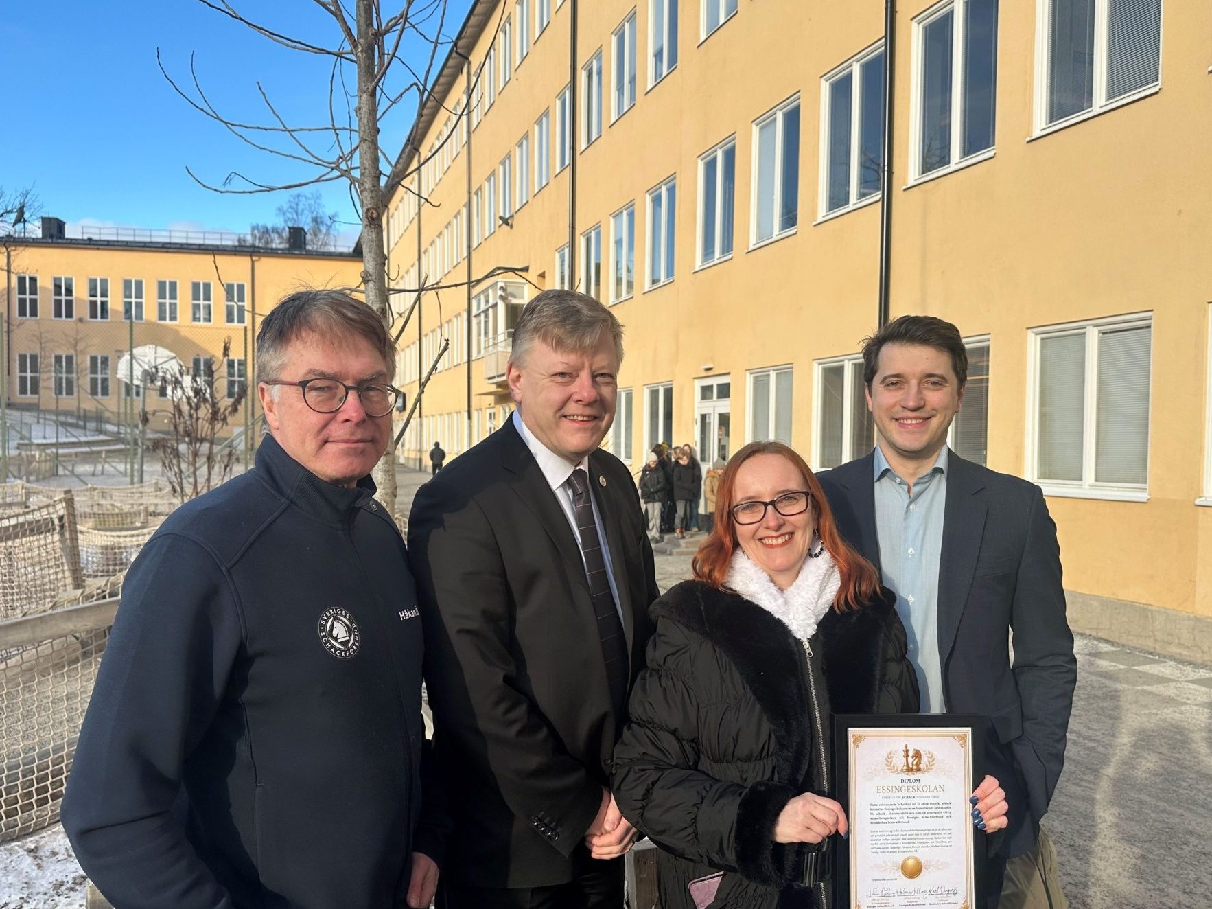 Essingeskolan i Stockholm har uppmärksammats för sitt engagemang i schack, och fick igår ta emot diplom från Sveriges Schackförbund. Skolan fick då besök av generalsekreterare Håkan Östling, tillsammans med Stockholms Schackförbunds ordförande Karl Dingertz och styrelsemedlem Alfred Krzymowski, som överlämnade ett diplom till Maria Helle, lärare på skolan.