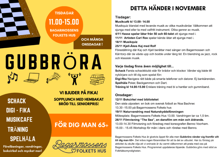 Aktiviteten äger rum på tisdagar mellan 11:00 och 15:00 i Bagarmossens Folkets Hus, Lillåvägen 44.