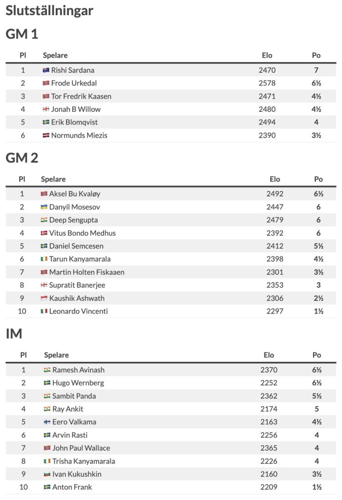 Normturneringen Hotel Stockholm North by First hotels young talents har ägt rum i Upplands Väsby. Bäst placerad svensk blev Hugo Wernberg som kom tvåa i IM-turneringen och bara var en halva från en IM-norm. Gruppen vanns av indiern Ramish Avinash och två andra svenskar Arvin Rasti och Anton Frank kom sexa respektive tia.