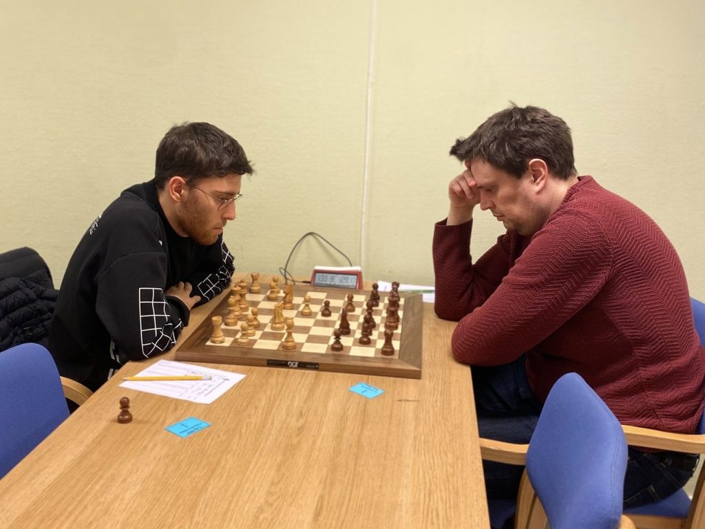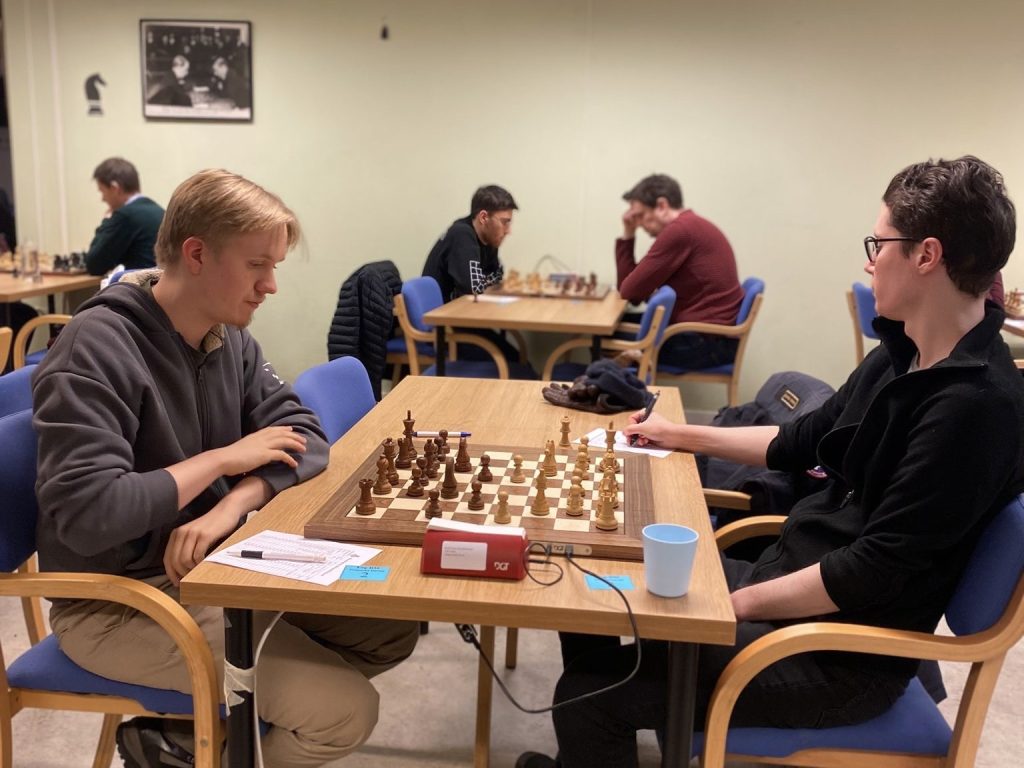 FM Carl Cederstam (Stockholms SS) – FM Adrian Söderström (Trojanska Hästen). Foto: Birger Wenzel/Stockholms Schackförbund.